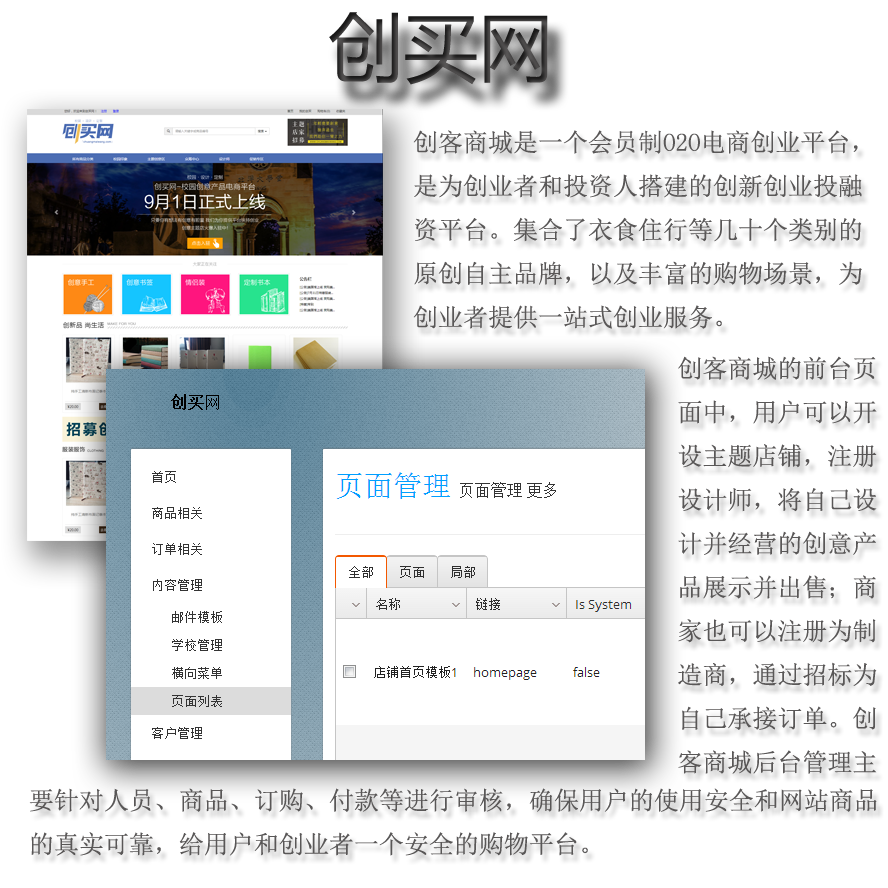 创客商城是一个会员制O2O电商创业平台,是为创业者和投资人搭建的创新创业投融资平台。集合了衣食住行等几十个类别的原创自主品牌,以及丰富的购物场景,为创业者提供一站式创业服务。 创客商城的前台页面中,用户可以开设主题店铺,注册设计师,将自己设计并经营的创意产品展示并出售;商家也可以注册为制造商,通过招标为自己承接订单。 创客商城后台管理主要针对人员、商品、订购、付款等进行审核,确保用户的使用安全和网站商品的真实可靠,给用户和创业者一个安全的购物平台。
