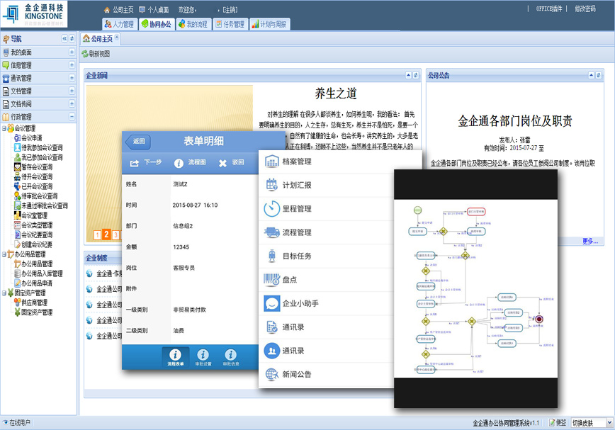 协同办公系统是将现代化办公和计算机网络功能、移动手机端结合起来的一种办公方式。协同办公系统的功能主要包括任务管理、公文管理、档案管理、新闻管理、内部信息、会议管理、流程管理等功能模块,符合企事业单位的办公习惯和特点,让用户轻松的完成日常办公工作,并且协同办公系统中实现了移动手机端同步操作功能,利用微信企业号通过手机可以轻松实现流程审批,新闻查看,计划汇报查询,目标任务的操作,员工通讯录查看等功能,打破时空的束缚,建立起新的办公模式。